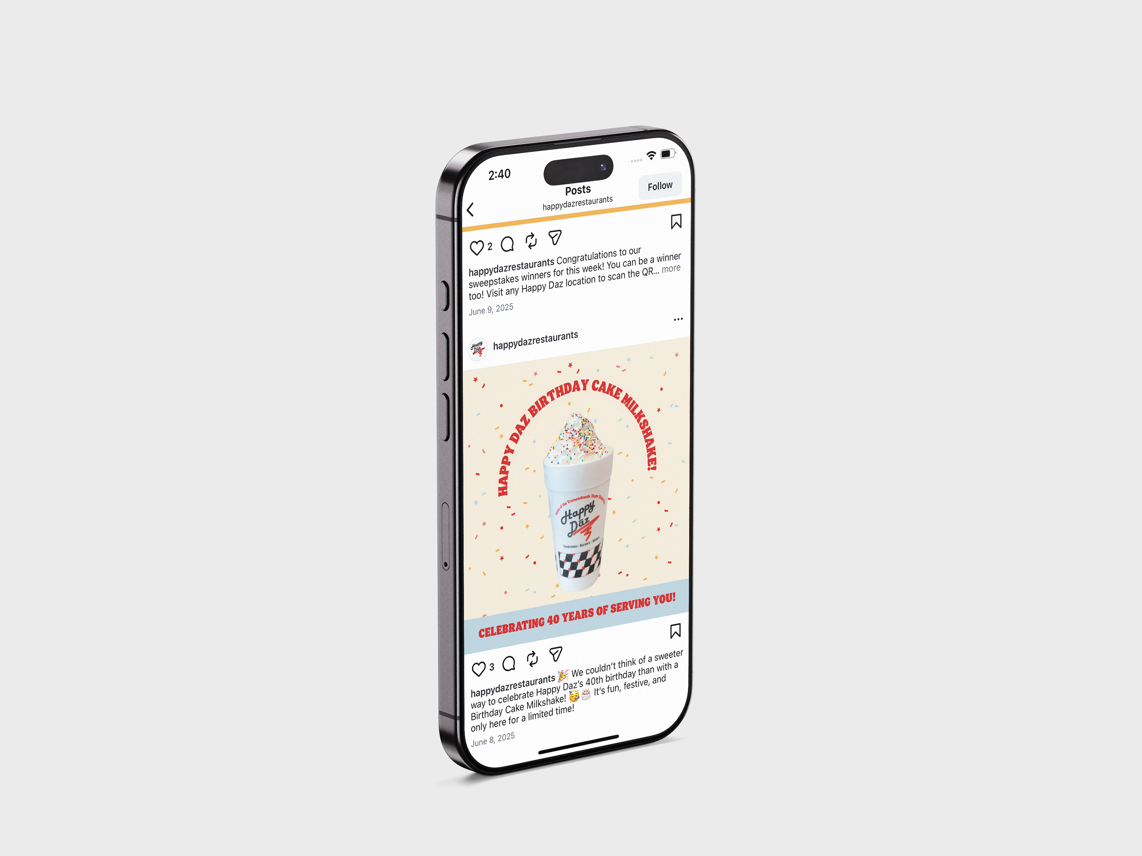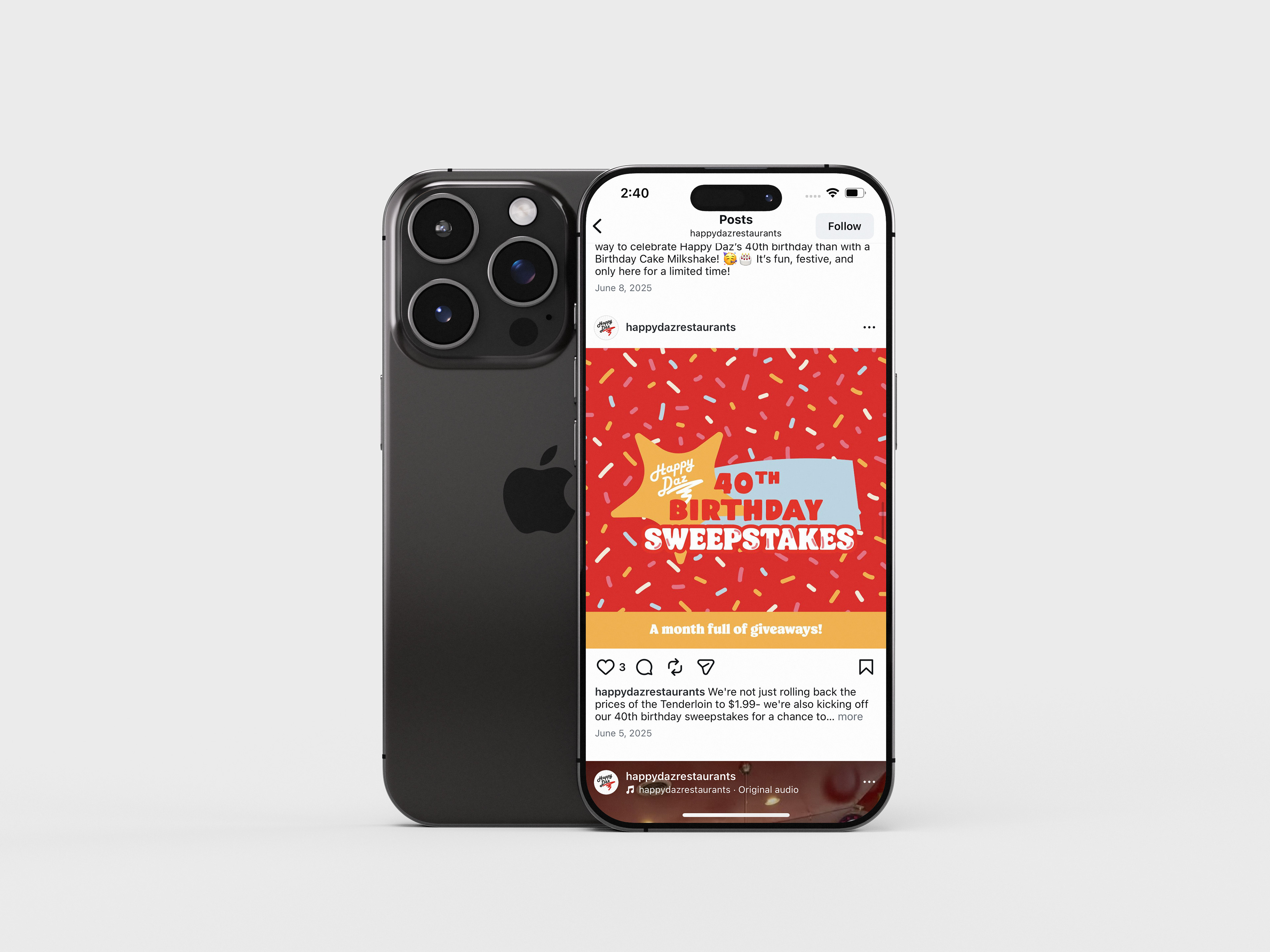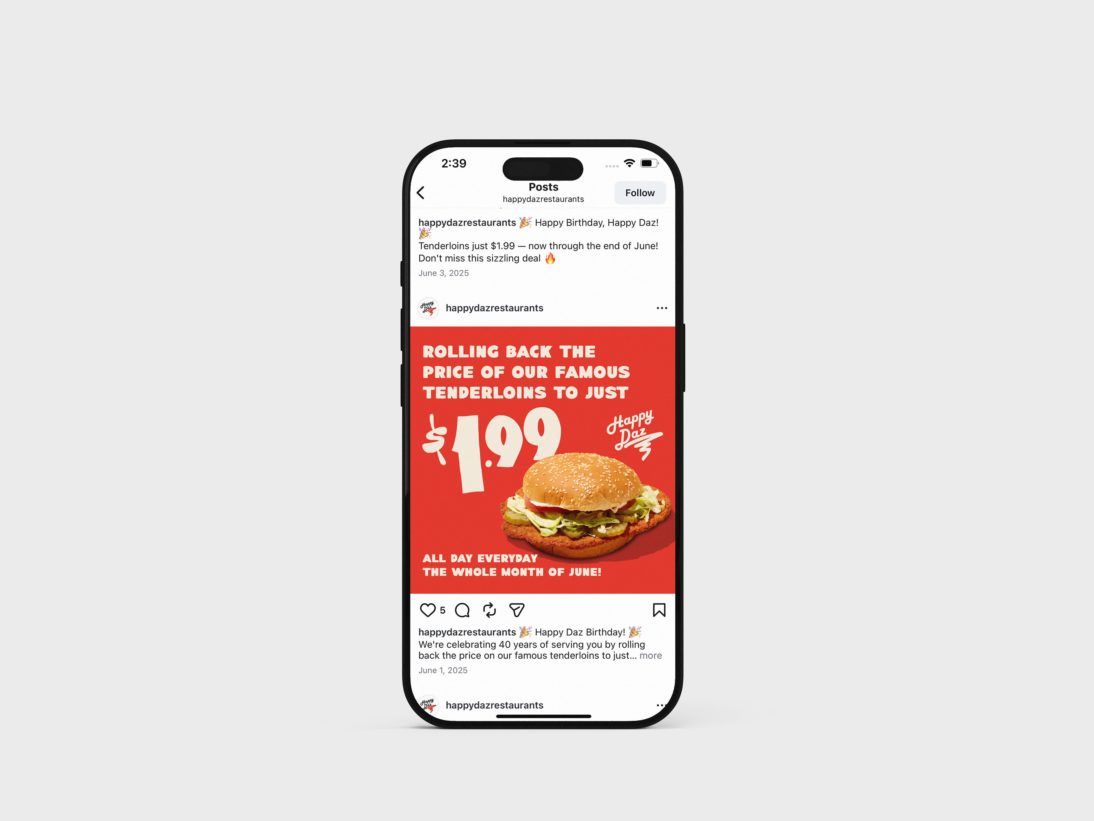The summer 2025 Promotion was a celebration for 40 years serving Happy Daz Customers. The promotion included $1.99 tenderloins (our signature item) & a featured birthday cake milkshake as well as giveaways throughout the month.